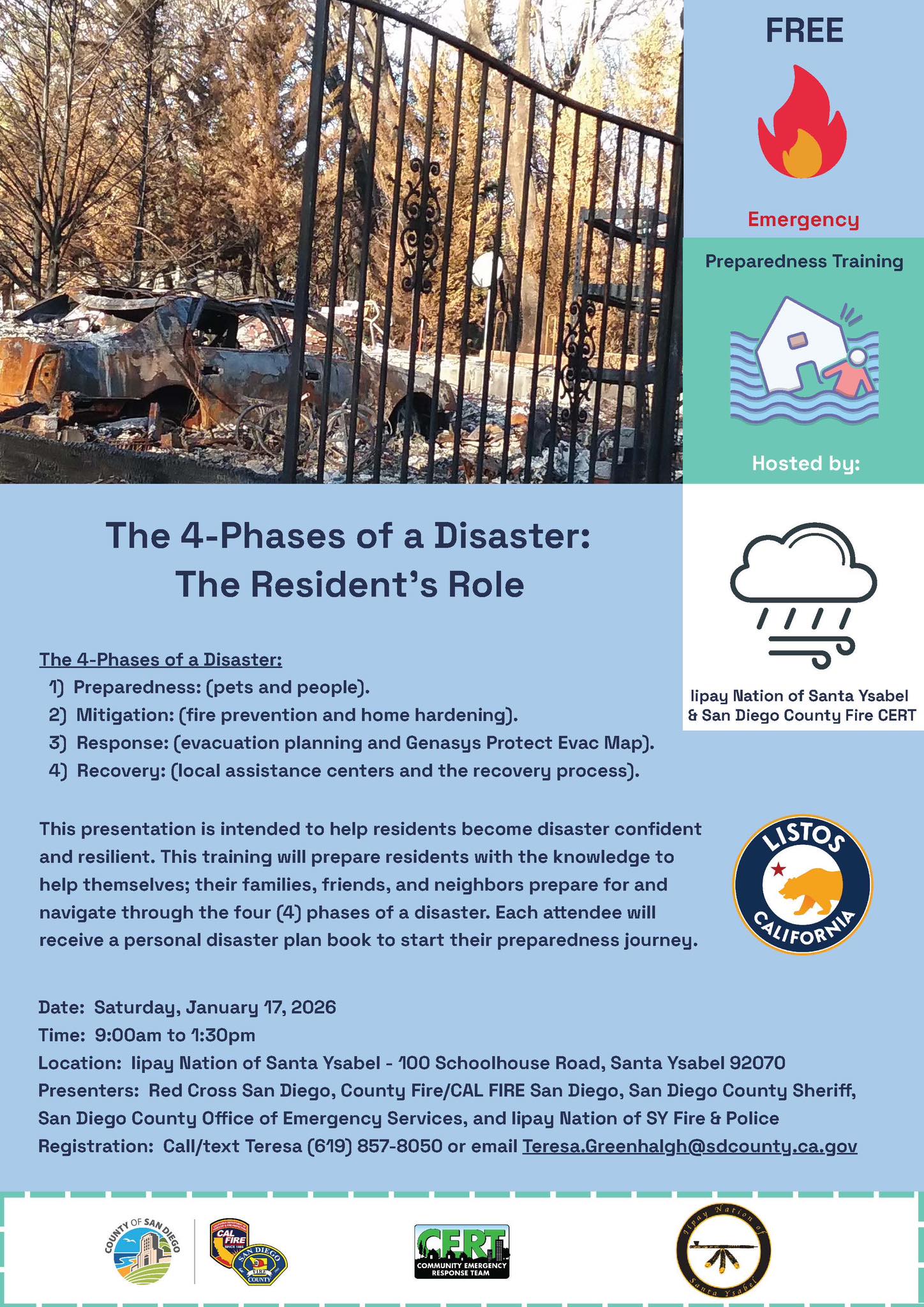« All Events Santa Ysabel – The 4-Phases of a Disaster: The Resident’s Role January 17 @ 9:00 am - 1:30 pm Free « Goldspotted Oak Borer Solutions Midcity Wildfire Preparedness Event » Add to calendar Google Calendar iCalendar Outlook 365 Outlook Live Details Date: January 17 Time: 9:00 am - 1:30 pm Cost: Free Organizer San Diego County Fire CERT Phone 619-857-8050 Email Teresa.Greenhalgh@sdcounty.ca.gov Venue Iipay Nation of Santa Ysabel 100 Schoolhouse Road Santa Ysabel, CA 92070 United States + Google Map